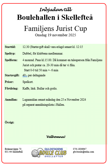 | Medlemmar Familjens jurist Cup 25-11-19 | 19 nov, 12:30 |